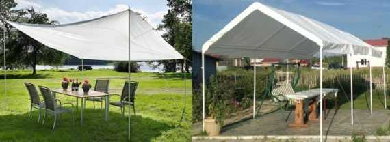 Небольшие навесы прекрасно подходят для создания уютной зоны отдыха летом. Такие навесы спасают от жаркого солнца, создавая тень. Они могут быть раскладными и иметь разную форму. Например, тентовые навесы шатры, или навесы зонтики. От сильного ветра и дождя такие навесы не спасут.