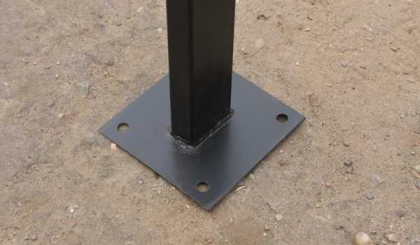- установка опор – здесь возможно несколько вариантов. Опоры, к которым будет крепиться каркас, могут быть забетонированы одновременно с укладкой пола. Другой вариант – стойка навеса с приваренной пяткой может крепиться анкерами к бетонному основанию (рис. 3)