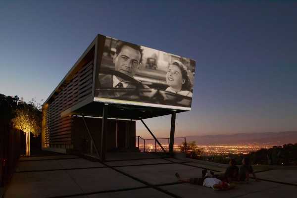 Просмотр фильма на боковой стене дома с навесом для машин