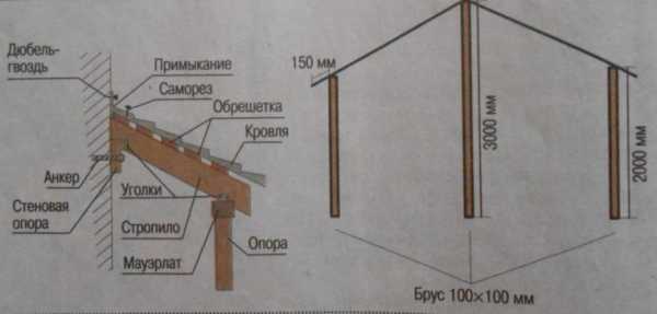 - Один конец стропил фиксируется кронштейном на брусе, закрепленном над входом в здание, второй — на мауэрлате.