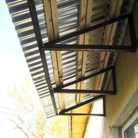- На стене обозначьте место крепления опор будущей конструкции. Из профиля сварите каркас козырька, укрепив его рёбрами жёсткости (чем длиннее каркас, тем больше элементов).