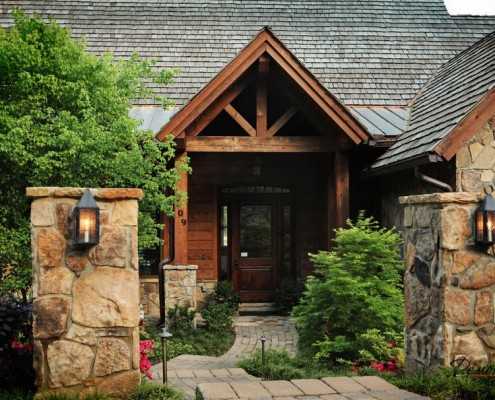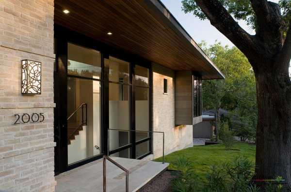 Как мы уже говорили, оформление навеса над крыльцом должно совпадать по стилю с экстерьером всего здания. Если ваш дом построен из деревянного сруба или кирпича в стиле кантри, то в данном случае козырёк должен быть деревянным с непрозрачной кровлей. Для дома, оформленного в стиле модерн, минимализм или хай-тек идеально подойдут подвесные конструкции из прозрачного материала. Оформляя дом в стиле прованс, вы можете использовать плоский навес над входом в качестве клумбы для цветов.
