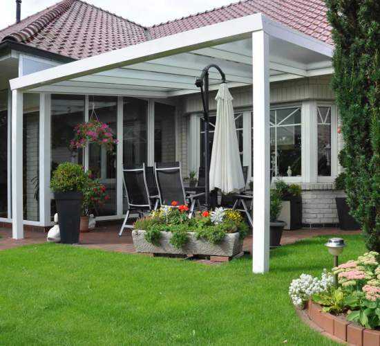- Пристроенные (к наружной стене, над крыльцом, балконом, входом). Пристроенные навесы вплотную примыкают к стене здания, соответственно одна сторона в этой конструкции закрыта, а другие три — открыты. Пристроенный навес очень функционален. Например, находясь у входной двери, он может выполнять роль веранды, а на заднем дворе его можно приспособить в качестве патио.