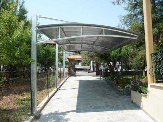 - Отдельно стоящие конструкции. Отдельно стоящие навесы напоминают перголу, отличаясь лишь обязательным наличием крыши. Обычно применяются в качестве стоянки для автомобиля или беседки. Часто такими навесами накрывают всю дорожку от ворот до дверей дома.