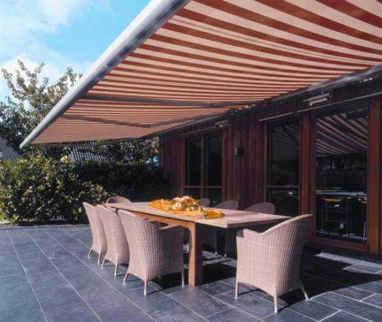 Этот вариант подойдет для тех, кто совсем не хочет возводить сложные металлические или деревянные конструкции. Навесы из ткани не потребуют возведения дополнительных конструкций, так как продаются уже с готовым каркасом, который остается только прикрепить к стене. Преимуществом такого навеса будет его возможность быстро складываться — воспользовавшись специальными рычагами или автоматикой.