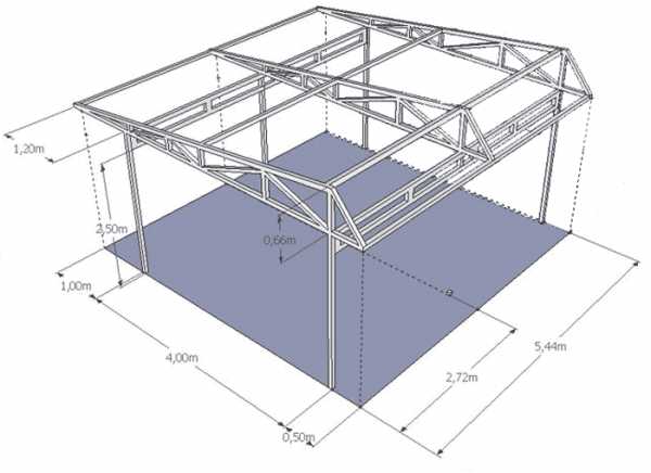 Самый распространенный вариант — строительство навеса из профнастила с несущим каркасом из квадратной стальной трубы.