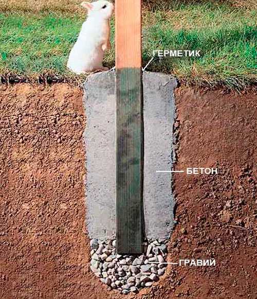 Самым простым способом будет выкопать яму глубиной 80 см. На дне обустроить 20-сантиметровую песчаную или щебеночную подушку, установить стойку, предварительно выровняв по отвесу, и остальное пространство заполнить бетоном. К нижней части стойки обычно приваривают опорную металлическую пластину.