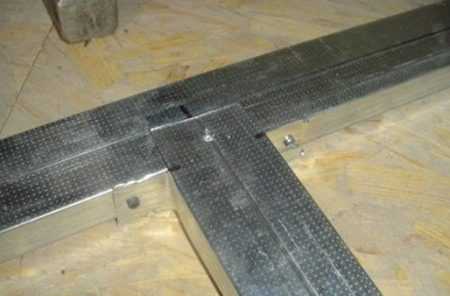 При помощи рулетки находят места поперечных стыков и в этих местах вставляют короткий поперечный профиль. Соединение выполняют при помощи вырезанного лепестка, как показано на фото.