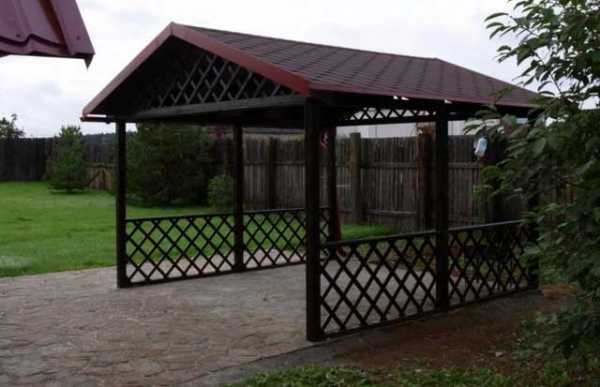 - Сооружения в виде кровли на нескольких опорах. Чаще всего встречаются навесы на четырех стойках, но в ряде случаев (например, для большой компании) можно использовать и каркас из шести и более стоек.