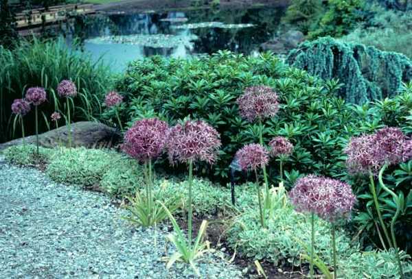 - Луки садовые. Луковичные карликовых сортов можно чередовать с гигантами. Сырые затененные места губительны для садовых луков. Предпочтительнее высадка культуры в апреле, но можно и осенью – в последней декаде сентября.