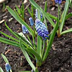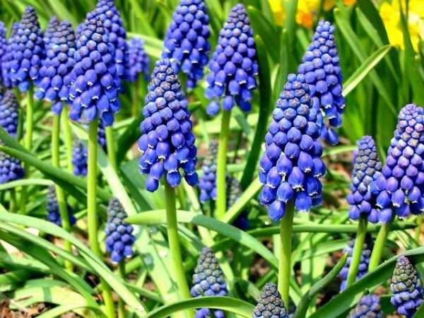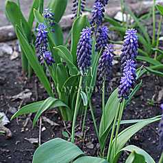 Мускари или Мышиный гиацинт (Гадючий лук). При всей своей привлекательности и быстром росте растение наделено неприхотливым и выносливым характером. Отличается большим количеством видов с разными сроками цветения: от апреля до конца сезона. На луковичке вырастает много деток, поэтому их можно рассаживать в сентябре в другие уголки сада. Те детки, которые затеряются в земле, прорастут самостоятельно в следующем сезоне. Если постоянное место жительства для Мускари пока не подобрано, можно временно высадить детки в стаканчики или корзинки с дренажом. Чаще всего высаживают такие сорта: Сине-голубую краску весны, Неглектум.