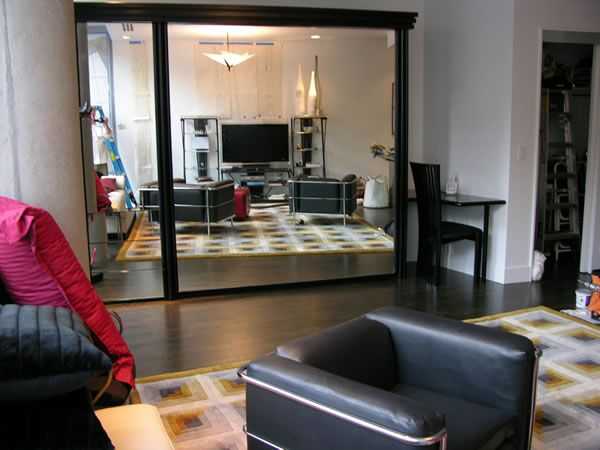 Не новый, но действенный шаг в вопросе увеличения пространства, стеклянные двери, скрывающие вход во вспомогательные помещения. Ход хороший, однако, приготовьтесь оборудовать такие двери жалюзи, которые будут скрывать расположенное за ними пространство в нужные моменты.