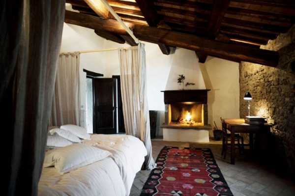 Уютный и теплый интерьер. Домашний уют в спальной создан благодаря размещению в ней камина.