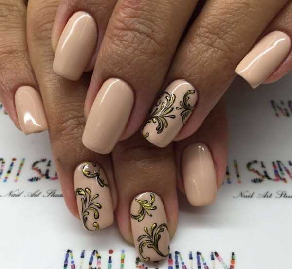 Настоящее произведение искусства – бежевый маникюр с элементами золота. Придите в нем на любое торжественное событие, и вы точно угадаете. Такой вариант будет актуален на новогоднюю вечеринку, романтический ужин, корпоративное мероприятие. С таким аксессуаром вы выгодно будете отличаться от других особ.