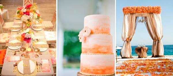 Свадебные цвета бежевый и оранжевый в торте, в свадебной арке и в декоре свадебного стола