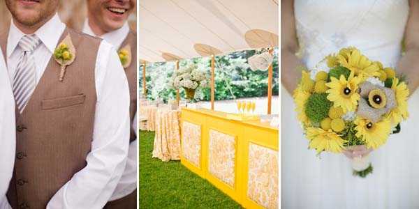 Свадебный зал, наряд жениха, и букет невесты в бежевых и желтых цветах