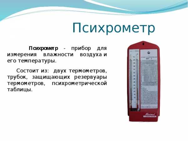 - Психрометр. Используется два термометра. «Сухим» проводится обычный замер. Второй датчик обернут тканью и погружен в воду. Показания термодатчиков проверяются таблицей, где выводится точный результат.