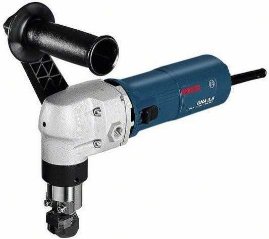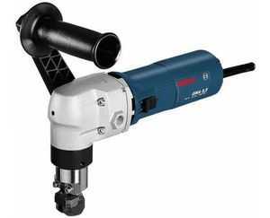 - Электроножницы. Этот тип инструмента наиболее подходящий, обладает высоким уровнем эффективности и комфорта при работе с ним. Электрические ножницы могут быть трех типов в зависимости от принципа их работы, а именно: вырубные, шлицевые и ножевые. Работа вырубных ножниц может осуществляться как с края листа, так и с его середины, однако, для обеспечения начала работы необходимо использовать дрель для создания стартового отверстия. Использование вырубных ножниц предусматривает наличие отходов в виде небольшого количества металла по линии реза.