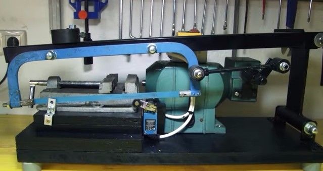 - Электричество для работы ножовочному полотну поступает от электродвигателя с помощью редуктора, ременной передачи и кривошипно-шатунного механизма.