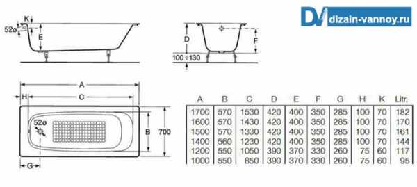 На картинке ниже можно ознакомиться сколько литров в разных объемах ванн.
