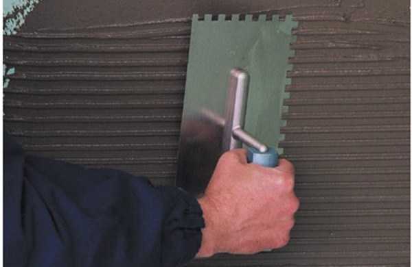 Наносится он при помощи шпателя с зубьями, и в первую очередь только на ширину первого нижнего ряда.