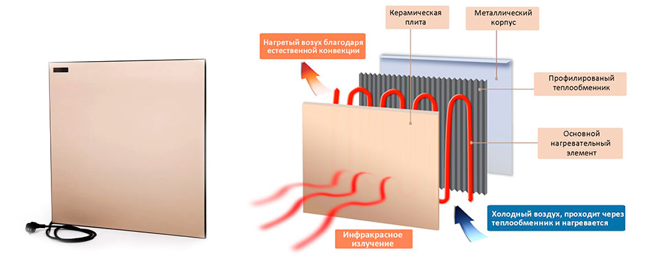 - с нагревательным элементом в виде керамического защитного слоя, который блокирует неприятное излучение в поле зрения. Этот тип электрических нагревателей отличается своей эффективностью и долговечностью. Их можно даже использовать во влажных комнатах: саунах, ванных комнатах. Их можно нагревать в течение длительного времени, но в то же время они сохраняют тепло в течение длительного времени после выключения. Не рекомендуется в потолочных и настенных версиях.