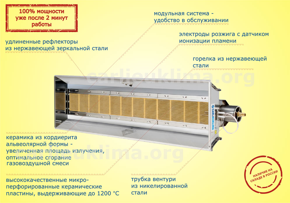 Элементы конструкции покрыты специальной глазурью, защищающей изделия от воздействия влаги. Нагрев происходит за счёт свойств инфракрасного излучения: лучи не нагревают воздух, а только объекты вокруг. Отлично подходят для использования на открытом воздухе и внутри помещений для локального обогрева. Керамические инфракрасные нагревательные элементы применяются для уплотнения и сушки. Обогреватели отличаются высокими эксплуатационными качествами, простым монтажом, практичностью, надёжностью и долговечностью.