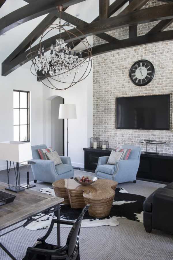 Дизайнеры советуют ограничиться центральным освещением, так как боковые источники подчеркнут искусственное происхождение кладки. Можно приобрести виниловые обои с реалистичной фактурой, благо в гостиной экологичность материалов играет не такую важную роль.