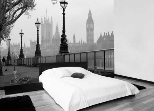 - Фотообои. В последнее время тенденция использования данного типа полотен снова вернулась и активно используется дизайнерами. В любом случае черно-белые обои – эффектный акцент любого помещения. Они могут быть самоклеящимися, текстурными, флизелиновыми, ламинированными, фресками с имитацией штукатурки, так что подобрать вариант под то или иное помещение можно без особого труда.