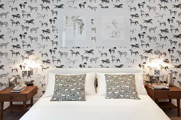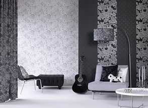 Классическим приёмом можно считать использование чёрно-белых обоев с различными принтами: с изображением цветов, с геометрическими фигурами, с изображением полиграфии и т.д. Единственными минусом использования такого вида обоев является их способность рябить в глазах, если долго смотреть на стену, выполненную в чёрно-белой гамме. Поэтому, постарайтесь избегать использовать такие обои, к примеру, в телевизионных зонах, лучшим вариантом их применения станут изголовья кроватей, стена за диваном и т.д.