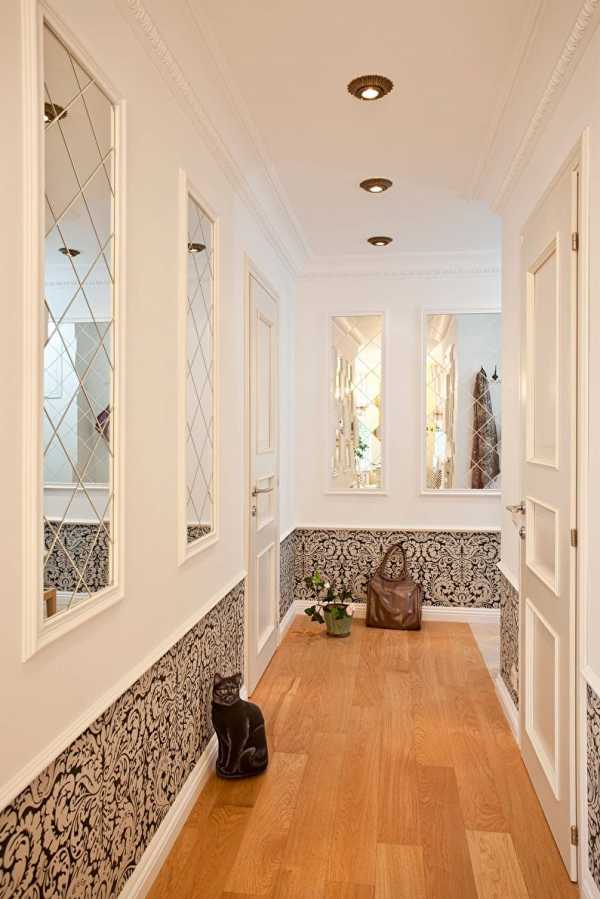 Обычно это помещение обладает небольшими размерами и не имеет окон, поэтому считается темным. Важно не подчеркнуть эту мрачность. В прихожей на стенах лучше не размещать обои с навязчивыми орнаментами. Идеальным вариантом станут бело-черные полотна с вертикальным мелким рисунком. Особенно это актуально для узких помещений, которые необходимо визуально расширить.
