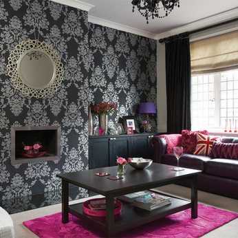 - Черные обои с рисунком можно использовать и в гостиной, но здесь важно не переборщить с дозировкой цвета. Его избыток сделает зал чересчур пугающим. Некоторым в подобной гостиной будет уютно, однако следует учитывать, что в квартире бывают и гости.