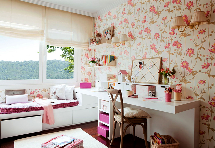 - С 9 до 11 лет девочки хотят «розовую» комнату, а мальчики – синюю, цвета морской волны. Останавливая выбор на цвете обоев, помните, что с этого возраста дети стают консерваторами и последующие несколько лет они не позволят что-то менять на их территории. Поэтому нужно потрудиться, чтобы их комната выглядела нормально и через несколько лет.