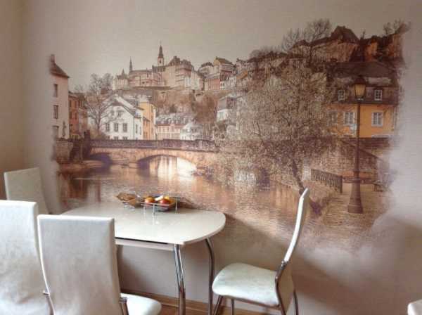 Фотообои – идеальный вариант для кухни. Главное то, что рисунок и сюжет не будет играть важной роли. Единственный момент, который нужно учесть – изображение на стене не должны уменьшать ваш аппетит. В кухню подойдет полотно с видом на уютное кафе, на маленькие улочки городов, парки и магазинчики. Они идеально впишутся в дизайн и стиль кухни. Цветовая гамма должна быть нейтральной.