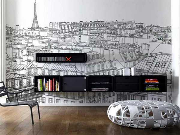 - Организуют пространство. Такая задача часто возлагается на обои с графическим точным изображением, где город, скорее, схематичен, будто это чертеж. Это чаще черно-белые обои, может быть, с одним цветовым акцентом.