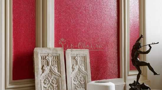 Красные обои, имитирующие стеклянную мозаику — красивый фон для белой мебели и темных скульптур.