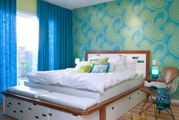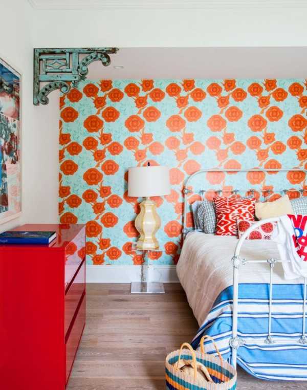 Чтобы спальня казалась более легкой, следует избегать на обоях всевозможных полосок, а остановиться на геометрических или цветочных узорах.