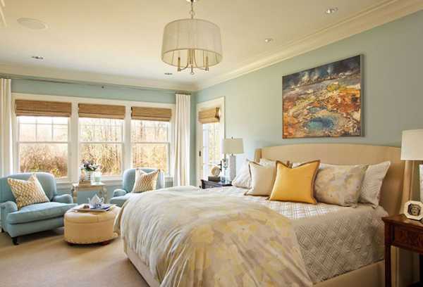 - Спальня вытянута по длине? Расширьте ее, оклеив стену у окна в более яркий цвет.