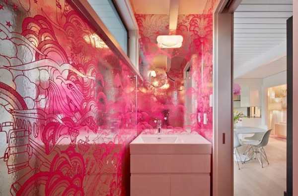 Так, на фото ниже мы видим яркую и смелую ванную комнату от творческой команды компании Flegel’s Construction. Для отделки стен дизайнеры использовали прочные, надежные и необычные зеркальные обои с яркими узорами цвета фуксия. При этом, как можно заметить на фото, остальные комнаты, в частности гостиная-столовая с открытой планировкой выдержаны в светлых, нейтральных и спокойных оттенках, таких как бежевый, белый, светло-серый.