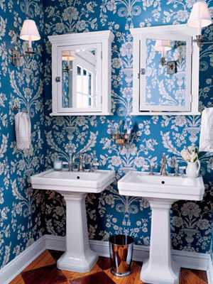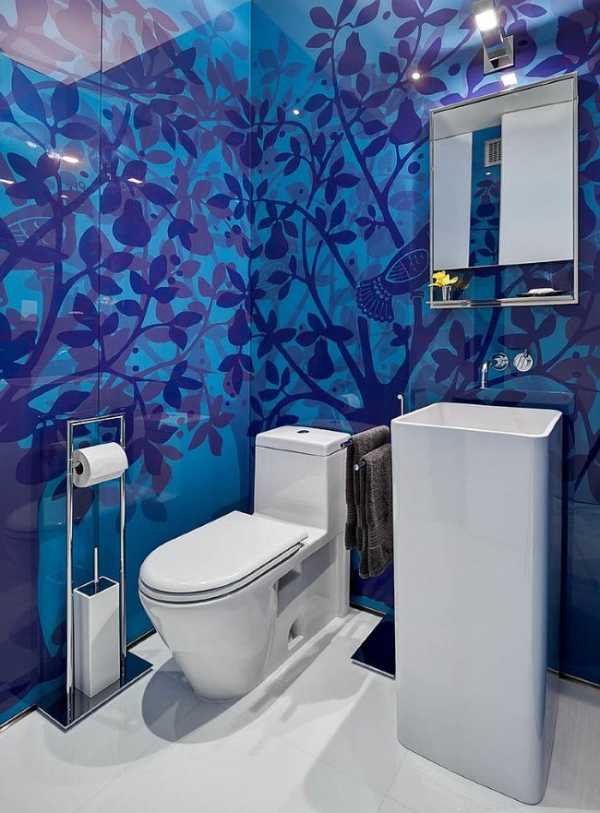 [adsleft] А вот еще одни необычные обои для небольшой ванной от дизайнеров компании ORA Studio / Richard Cadan. Голубые обои с синими рисунками стали настоящим украшением ванной комнаты, также они гармонично сочетаются со стандартной сантехникой белого цвета, серебристыми аксессуарами, мебелью и украшениями.
