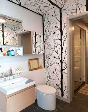 - Первое, на что нужно обратить внимание в комнате для гигиенических процедур, так это тот факт, что обои можно наклеить своими силами. И не стоит тратиться на услуги подрядчиков.