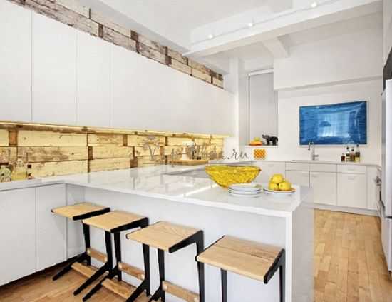 Покрытия из натуральной древесины хорошо смотрятся в кухонном пространстве и в столовой зоне. Специалисты рекомендуют использовать флизелиновые покрытия, заменяющие привычные фартуки.