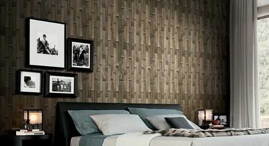 - Разнообразие моделей. Внешний вид изделий формируется в зависимости от породы дерева. Кроме экономичных вариантов из ели и сосны, популярностью пользуются покрытия, выполненные из липы, осины, березы. В зависимости от обработки обои приобретают темные или светлые оттенки. Природный рисунок, тиснение, узоры служат естественным декором. При создании уникального интерьера можно приобрести изделия на заказ, выполненные с учетом индивидуальных требований. Отделка стен деревянными обоями меняет внешний вид при использовании разных видов укладки: горизонтального, вертикального, диагонального.
