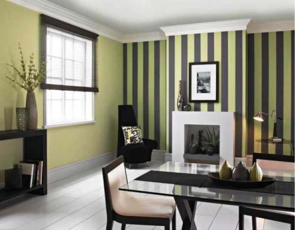 Обычно вертикальное сочетание встречается в небольших по размеру комнатах, так как полоски, уходящие вверх, зрительно приподнимают высоту поверхностей потолков.