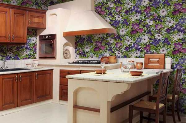В настенной отделке кухонь в деревенском стиле нередко можно увидеть клетку, горошек, изображения фруктов и овощей, цветов, домашних животных и птиц. Очень часто рисунок обоев повторяет другие типы отделки: кирпичную и каменную кладку, плитку, деревянную вагонку, стебли бамбука и тому подобное. В больших помещениях такой спокойный фон может служить обрамлением для фотообоев или крупного настенного декора (картин, часов, подвесных полок, оригинальных светильников).
