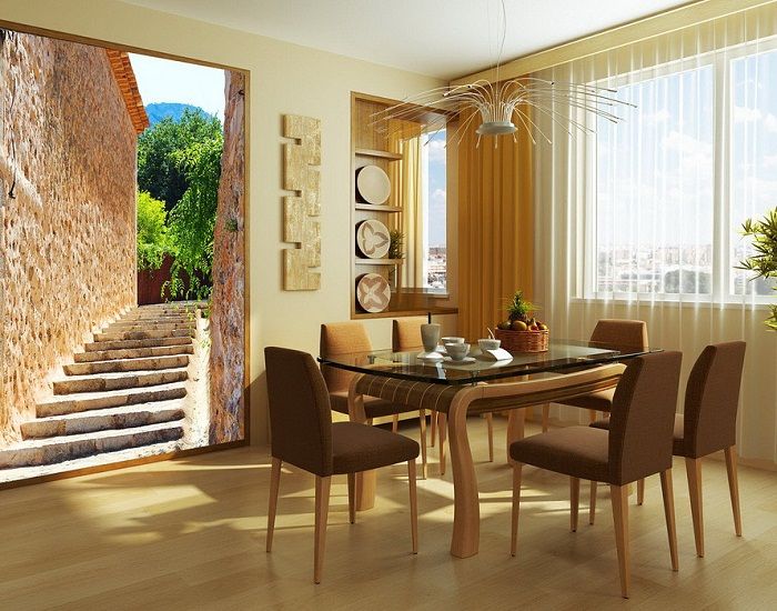 При наличии обеденной группы рекомендую оформлять фотообоями стену за ней. Либо другую стену, не заставленную неподвижной мебелью.