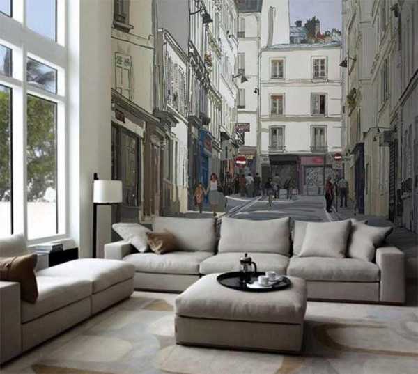 - Дизайнерские обои с архитектурным рисунком подходят для комнат с малым количеством мебели и картин, для прихожей.