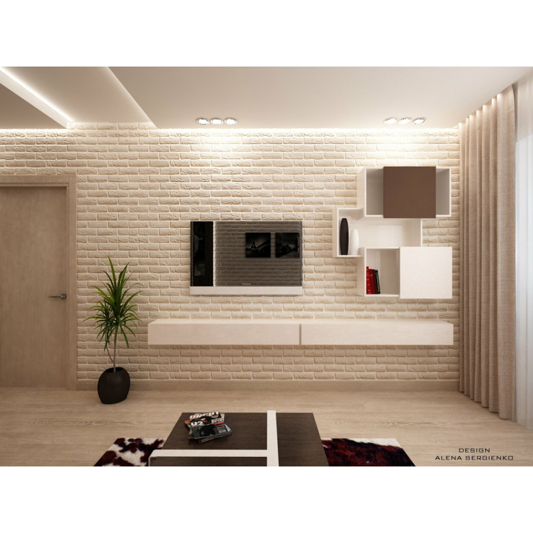 - разнообразные оттенки — можно найти оптимальный цвет, исходя из общей цветовой гаммы – белый, серый, насыщенный оранжево-коричневый, а также рисунок старого, облупившегося кирпича или идеально ровной кладки;