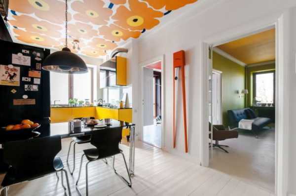 Обои на потолке – недорогой способ преобразить кухню.