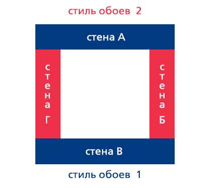 Соседние стены оформляются в одном стиле, чтобы придать им одинаковую важность. Один узор наклеивается на плоскости Б и В, другой — А и Г.